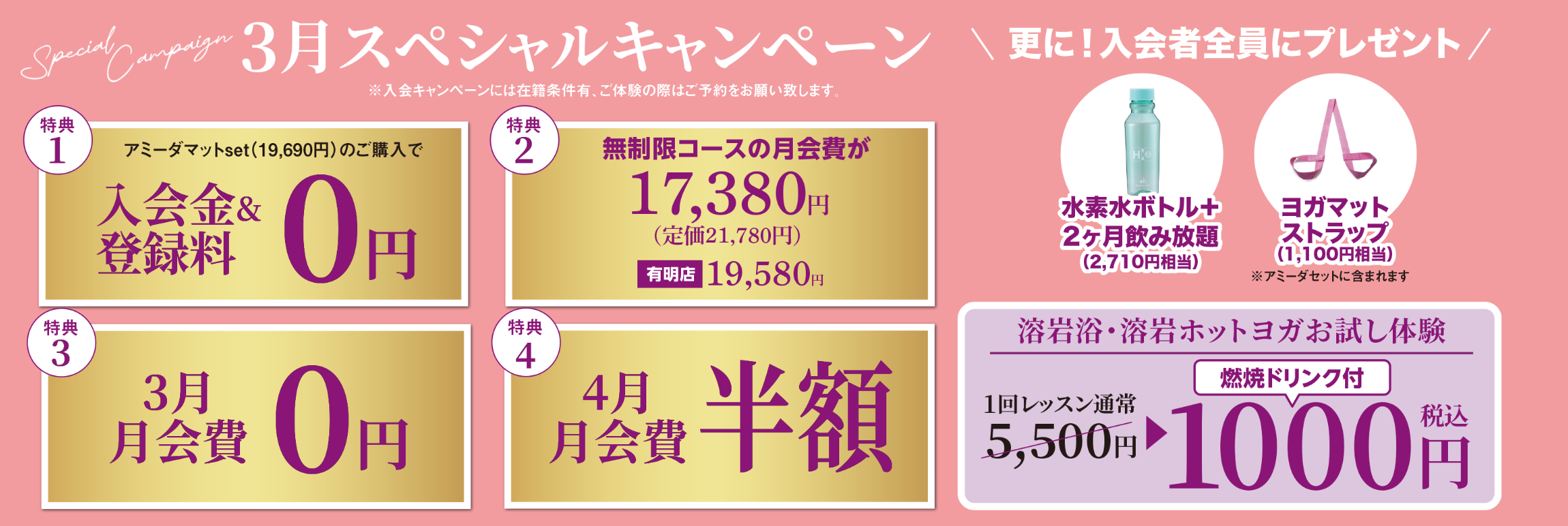 なので、ヨガマットをすでに持っていようが、アミーダマットセット(19,690円)を購入して入会キャンペーンで入るのが一番お得!